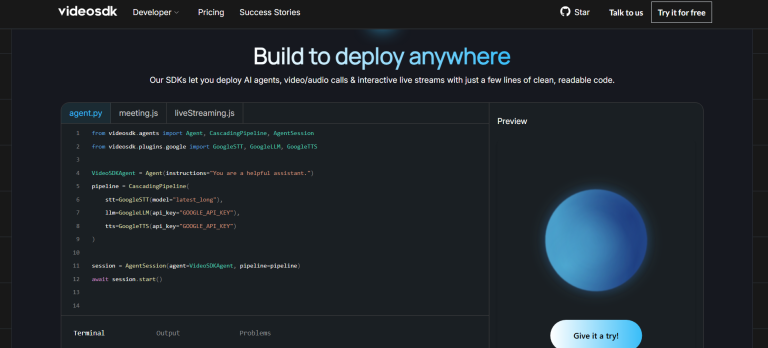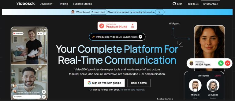 A: VideoSDK provides developer tools and low-latency infrastructure to build, scale, and secure immersive live audio/video + AI communication experiences within applications.