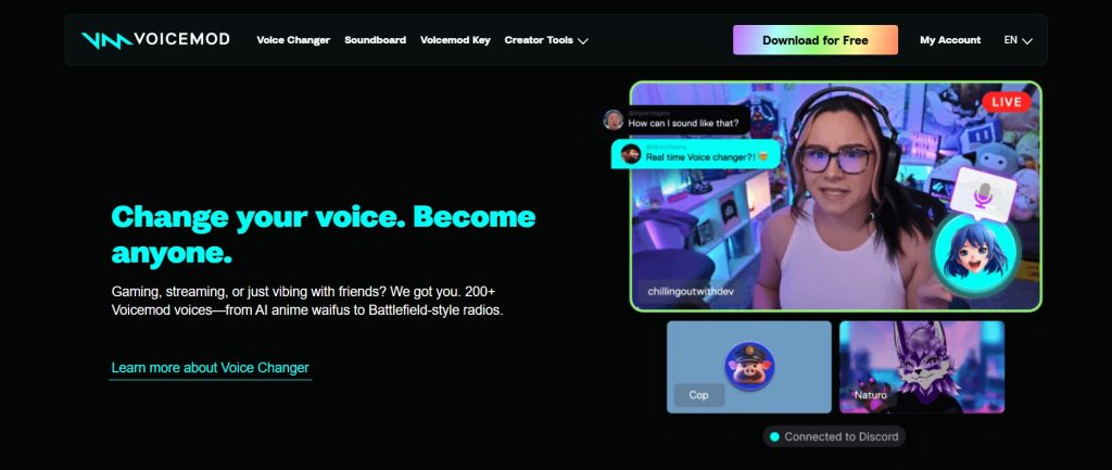 • Online Communication: Adds a fun and personalized touch to voice chats on platforms like Discord, Zoom, and Skype for casual conversations or virtual meetings.